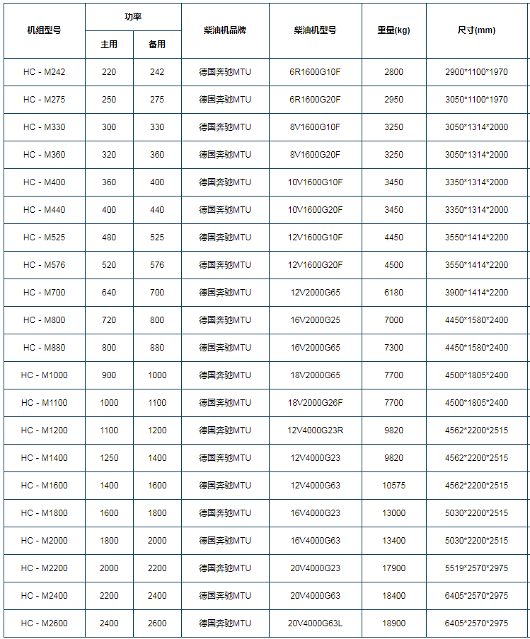 MTU是德国戴姆勒-克莱斯勒集团的柴油机推进系统部分,也是***上的重载柴油机制造公司,其产品广泛用于军事、铁道、越野车辆,海上舰艇及电站(包括不停顿备用电站)。 早于1883年MTU便开发出了台***速车用内燃机,1901年又设计、制造了******的梅赛德斯(Mercedes)汽车,以后又陆续开发了多种***豪华的车型及发动机。1909年开始设计制造飞机发动机,1923年又开始生产***性能的柴油发动机。至今,其生产的发动机已超过174000台,用户遍及***各地。德国奔驰MTU的2000系列、4000系列是目前***的柴油发动机。是德国发动机涡轮机联盟弗里的希哈芬有限公司(MTU)于1997年开发制造上市的,包括八缸、十二缸、十六缸、十八缸、二十缸五种不同型号,输出功率范围由270KW至2720KW。 它是一种超前的设计,并装备有电子管理系统MDEC,该电子管理系统改变了传统***压油泵的概念,类似于“***轿车”上的电喷(一个缸对应一个电喷泵)。MDEC电子管理系统,即相当于在德国奔驰2000、4000系列发动机上装了一个工业电脑,并有很多传感器通过许多电缆联接至电脑上,而电脑中的模块是出厂前固化的,以确保在不同的环境、不同的工况下,都能给出一个合适的电喷量:喷油压力、喷油量、喷油角度、喷油的开启和关闭时间。